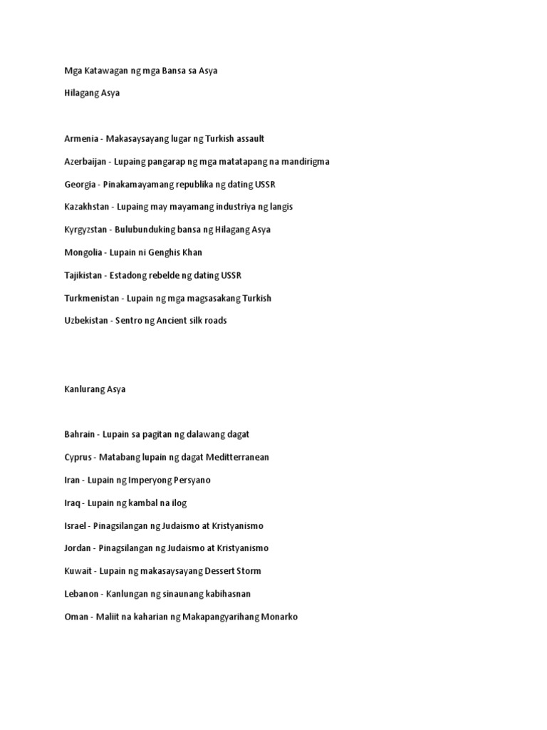 Ito ay nahahati sa limang rehiyon. Bandar Seri Begawan Kilala rin bilang Bansa Ng Brunei Tahanan ng Kapayapaan ay isang bansa na nasa hilagang baybayin ng pulo ng Borneo. Uzbekistan Kabuuang sukat 447 400 km kuwadrado Kabisera Tashkent Yunit ng Salapi Uzbek Som Ang bansang ito ay isang bansang landlocked.