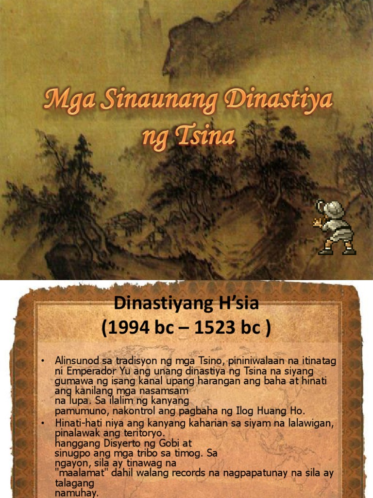 Bumagsak ito dahil sa ibat-ibang mga pag-aalsa na ang isa ay. Dinastiyang Hsia 1994 bc 1523 bc Alinsunod sa tradisyon ng mga Tsino pininiwalaan na itinatag ni Emperador Yu ang unang dinastiya ng Tsina na siyang gumawa ng isang kanal upang harangan ang baha at hinati ang kanilang mga nasamsam na lupa. Ang mga dinastiya ng Tsina mula sa pinaka unaDinastiyang Hsia- Pinamunuan ni Emperador Yu.