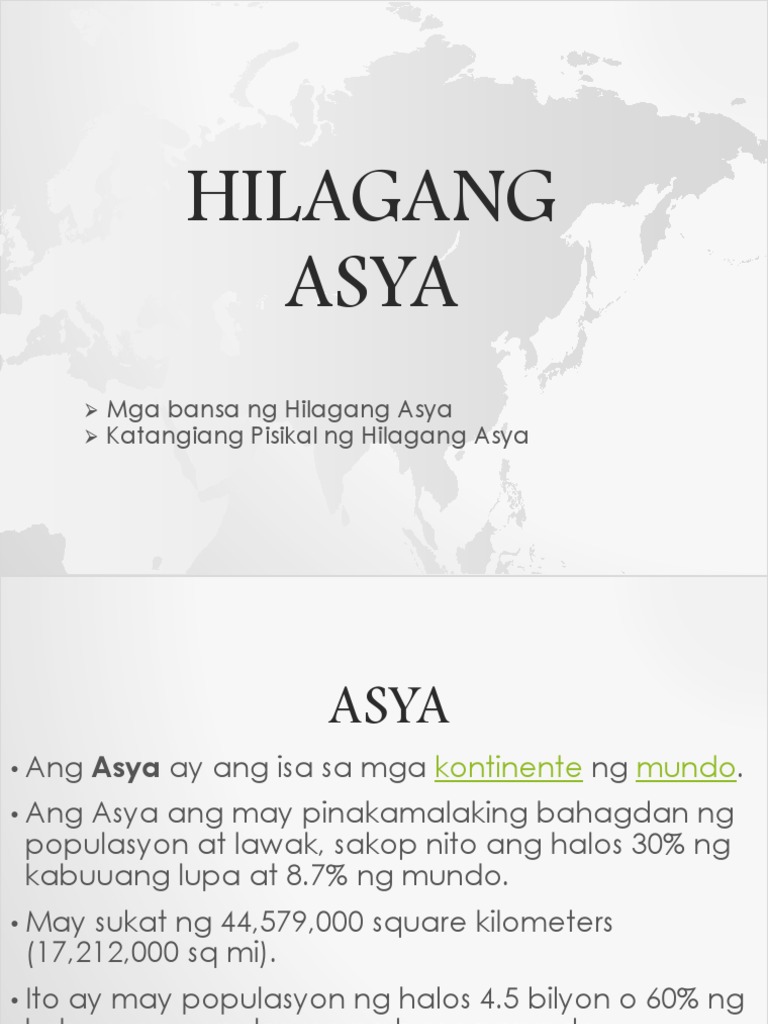 1SILANGANG ASYA 2TIMOG SILANGANG ASYA 3TIMOG ASYA 4TIMOG KANLURANG ASYA 5HILAGANG ASYA. Ang kontinenteng Asya ay ang pinakamalaking kontinente sa buong mundo. Ano ang mga likas na yaman sa mga bansa ng rehiyong hilagang asya.